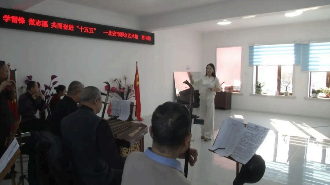 市群众艺术馆与图书馆关⼯⼩组组织⽂化志愿服务队,先后深⼊热电社区和庆华⽼年退管中⼼,开展以“学雷锋做志愿共同奋进‘⼗五五’”为主题的学雷锋志愿活动。
