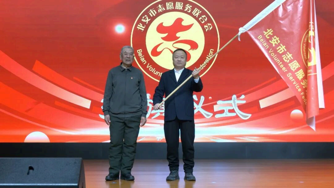 在授旗仪式上,尚⽟⼭⽼⼈将象征责任与光荣的志愿服务旗帜授予市志愿服务联合会,标志着学雷锋志愿服务精神的代代相传和学雷锋志愿⼒量的接续奋⽃。