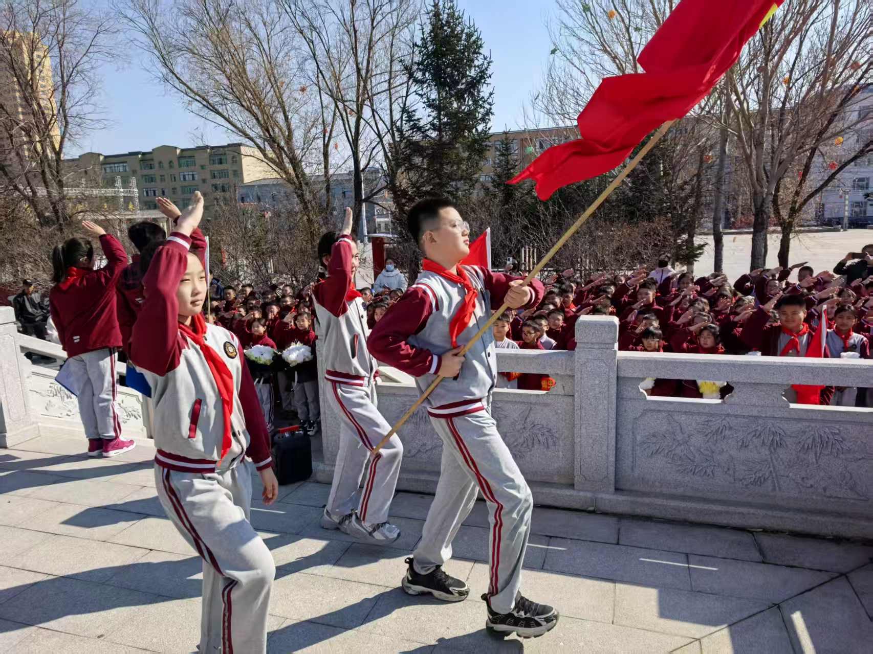 活动中,出旗敬礼、默哀追思、校长讲话、队员发言、宣誓明志、敬献花束,每一个环节都庄严肃穆。少先队员们举起右拳,以红领巾的名义庄严宣誓:“人民为先,祖国至上;诚实勇敢,自律自强;奋发有为,誓作栋梁;振兴中华,再造辉煌!”铿锵有力的誓言响彻广场,彰显着新时代少年传承英烈精神、勇担时代使命的坚定决心,在现场接受了一堂深刻的爱国主义教育课。
